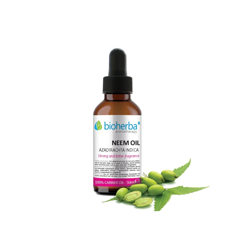Маслото от нийм (Azadirachta indica kernel oil) се получава чрез студено пресоване на семената на дървото нийм, познато в Индия с впечатляващите си терапевтични свойства. То се отличава с интензивен характерен аромат, дължащ се на богатия му състав от биоактивни вещества. От векове се използва в Аюрведа и традиционната медицина благодарение на своето противовъзпалително, антибактериално и противогъбично действие. Маслото прониква в дълбочина, подпомага регенерацията и ефикасната грижа за кожа, коса и нокти. Високото съдържание на мастни киселини и витамини го прави изключително полезно при раздразнения, сухота и склонност към инфекции.