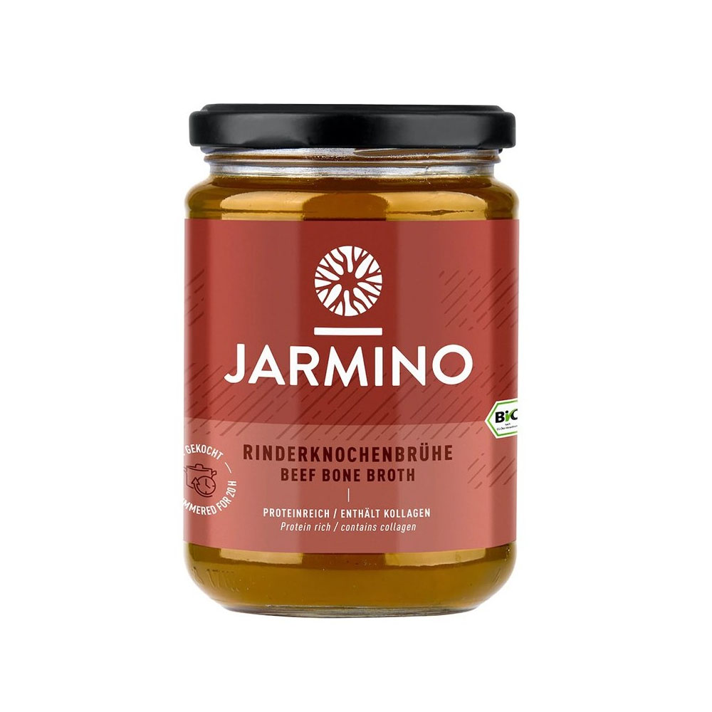Beef bone broth organic на Jarmino е телешки костен бульон от пасищно отглеждани говеда и зеленчуци от органични ферми в Бавария и Тирол. Той преминава през технология на бавно готвене до 20 часа, която осигурява освобождаване на ценни вещества като колаген, аминокиселини и минерали. За още по-добър вкус и допълнително количество витамини, Beef bone broth organic е обогатен със зеленчуци от биологично устойчиво земеделие (лук, домати, моркови, целина, праз, мащерка), каменна сол, ябълков оцет и мащерка.