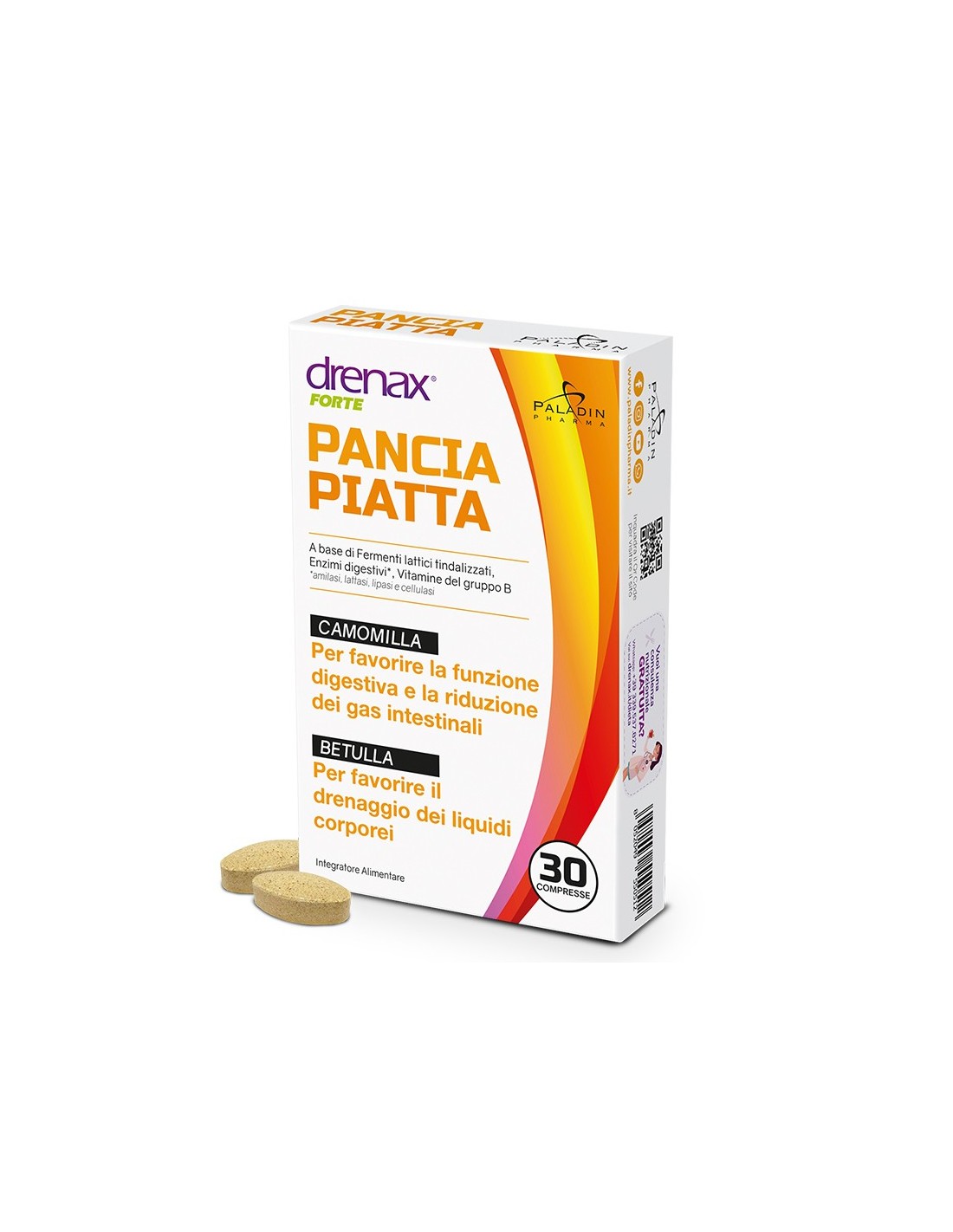 Drenax® Forte Pancia Piatta – Дренакс Форте (плосък корем) е хранителна добавка, която съдържа в състава си пробиотични бактерии и хранителни ензими и поддържа здравето на стомашно-чревния тракт. Подпомага процесите на храносмилане, разграждане и усвояване на приетите с храната вещества (протеини, въглехидрати и мазнини и лактоза). Спомага за намаляване на дискомфорта и дисбаланса в храносмилателната система и подпомага заселването на добрите бактерии в стомаха и червата. Освен това допринася за намаляване на симптоми като газове, болки и подут корем и насърчава поддържането на нормално телесно тегло. Тази хранителна добавка подобрява целия храносмилателен процес, устойчива е на стомашната киселинност и спомага за повишаване на тонуса и енергията.