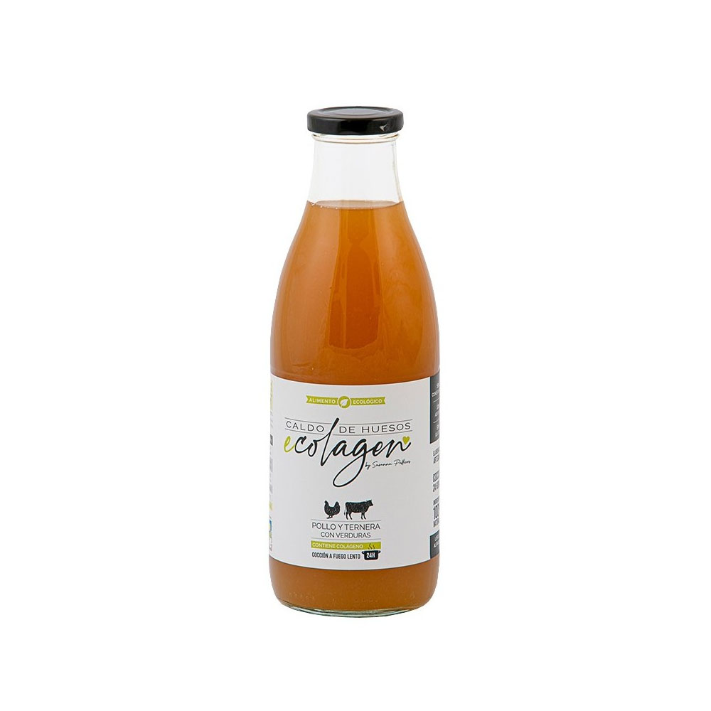 Pollo y ternera Con Sal Ecolagen Ecolagen е изцяло натурален продукт, без съдържание на консерванти, алергени и ГМО. Неговият състав включва пилешки и телешки костен бульон от свободно пасящи животни, зеленчуков микс от лук, праз, морков и дафинов лист от органично земеделие, ябълков оцет и хималайска сол. Костният бульон е източник на витамини от група B, аминокиселини и колаген – главният белтък в съединителната тъкан при бозайниците и човека. Той има важна роля за здравето на костите, ставите, зрението, стомашно-чревния тракт и кожата. Също така засяга състоянието на венците, кръвоносните съдове и нервната система.