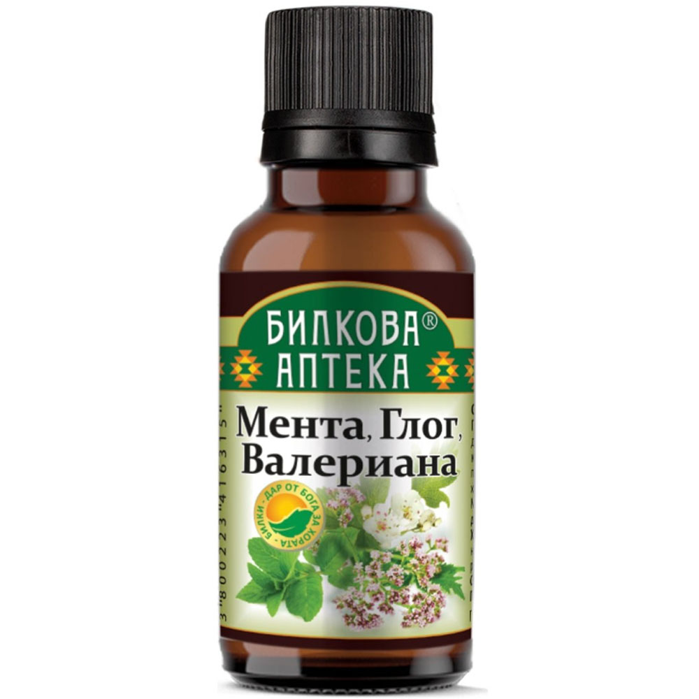 Тинктура Мента, Глог и Валериана е мощна натурална комбинация, създадена за успокояване на нервната система, подобряване на сърдечната функция и облекчаване на стреса. Екстрактът от мента помага за облекчаване на напрежението и храносмилателния дискомфорт, докато глогът укрепва сърцето и подпомага кръвообращението. Валерианата допринася за релаксацията и осигурява качествен и спокоен сън. Тази синергична формула е особено подходяща при състояния на тревожност, нервност, безсъние или повишено напрежение, като същевременно подкрепя сърдечно-съдовата система. Лесна за употреба и с висока концентрация на активни съставки, тинктурата осигурява бързо и ефективно облекчение. Редовната ѝ употреба допринася за усещане за баланс, вътрешен мир и по-добро общо състояние. Това е идеално натурално средство за грижа за ума, сърцето и нервите.